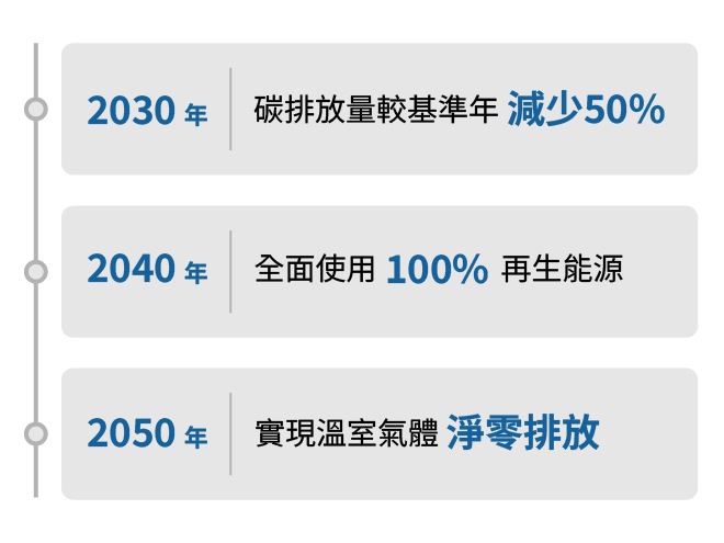 此外,為響應政府2050淨零排放政策,資拓宏宇以2023 年為碳排放基準年,並依循國際淨零趨勢,訂定範疇一及範疇二階段性減碳目標,包含: